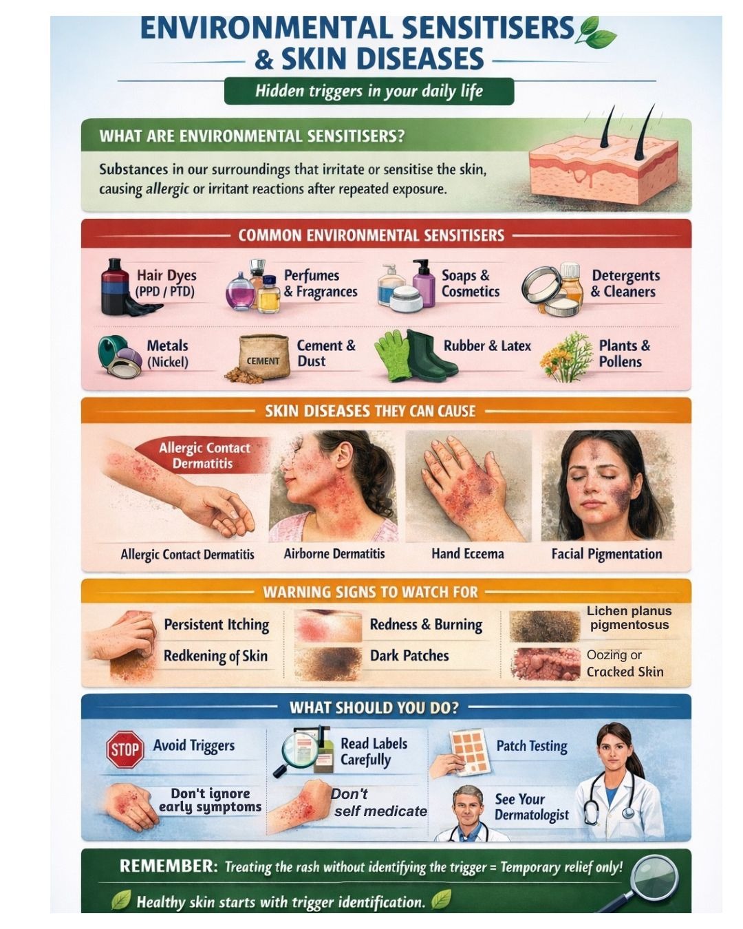 Your surroundings may be irritating your skin more than you realise! Many everyday substances in our environment can sensitise the skin and trigger allergic or irritant contact dermatitis, leading to itching, pigmentation, rashes, or chronic eczema. • Hair dyes – PPD, PTD • Fragrances & perfumes – in soaps, creams, deodorants • Preservatives – parabens, formaldehyde releasers • Metals – nickel (jewellery, watches, buttons) • Cement & construction dust – chromates • Rubber & latex – gloves, footwear • Plastic footwear • Plants & pollens – airborne contact dermatitis • Detergents & cleaning agents Repeated exposures cause allergic rash, chronic eczema and pigmentation What You Should Do ✔ Avoid repeated exposure ✔ Read product labels carefully ✔ Patch testing for chronic or recurrent cases ✔ Early dermatology consultation prevents long-term pigmentation & scarring Healthy skin begins with identifying the trigger! If your skin reacts repeatedly, don’t ignore it. Consult your dermatologist for proper diagnosis & patch testing.